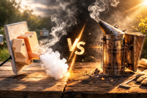 When bees are just coming out of winter — before the first brood — they can be more defensive. At this stage my bees did not take kindly to the Apisolis vaporizer, and I had to switch to a traditional smoker, which worked like a charm.