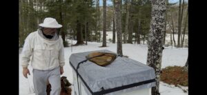 During this first warm spell there is still no natural forage, so it’s a good time to feed the bees their own fall honey that I stored for them in the freezer.